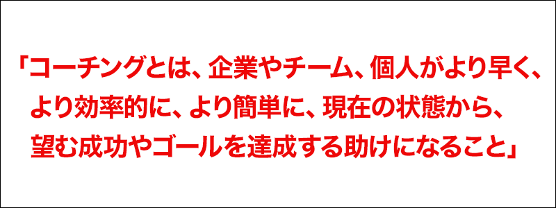 「コーチングとは、企業やチーム、個人がより早く、より効果的に、より簡単に、現在の状態から、望む成功やゴールを達成する助けになること」